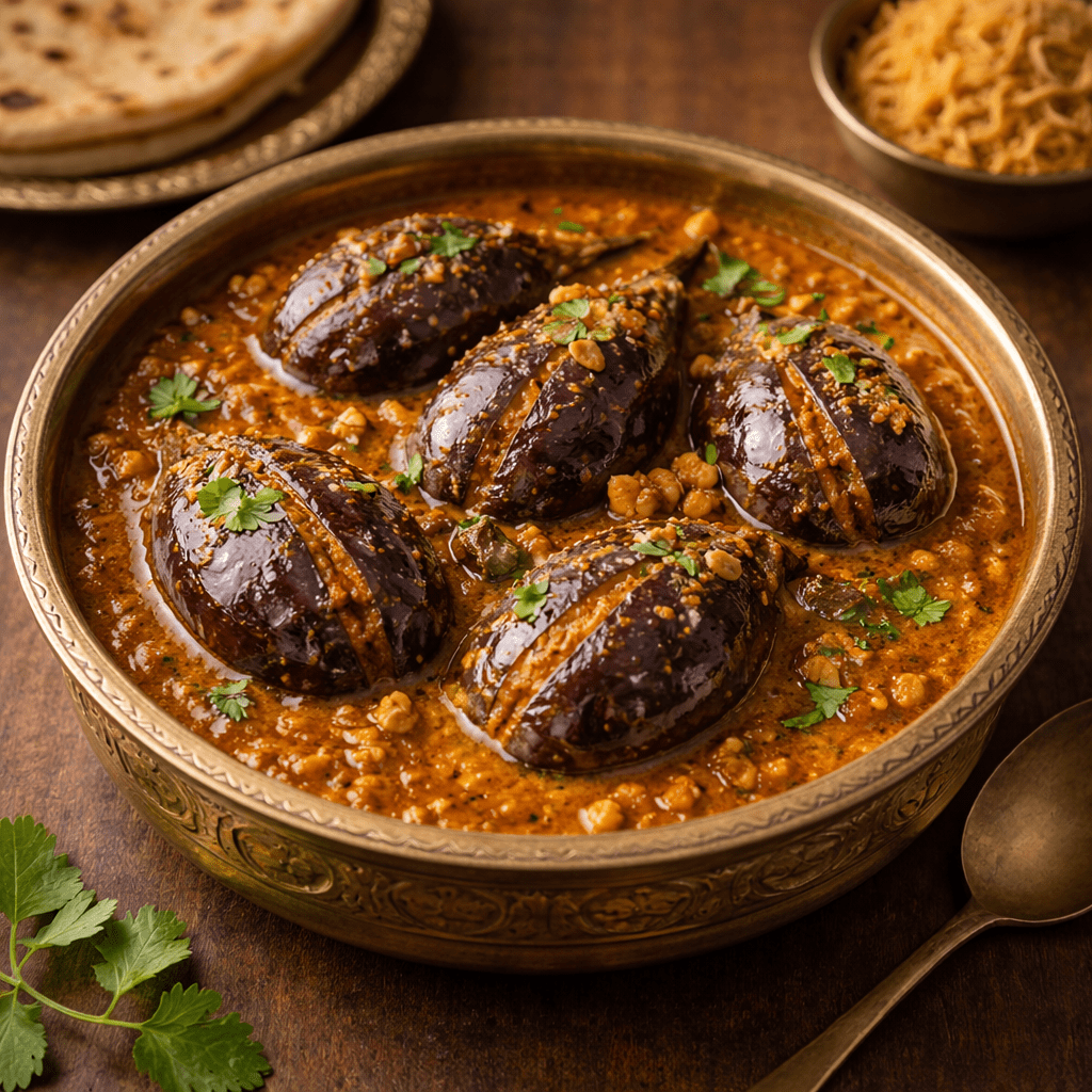 Maharashtra’s diverse regions each add their own twist to Bharli Vangi.  In the coastal Konkan area (including Malvan), for example, cooks often add roasted peanuts and fresh coriander to the stuffing and may use a local Malvani spice mix for heat.  Moving inland to the Deccan (around Pune and Satara), the curry is gently sweetened with jaggery and soured with tamarind, and scented with goda masala – a signature Marathi blend of warm spices.  Further south in Kolhapur, the version is noticeably spicier: cooks layer in fiery Kanda Lasun masala (an onion-garlic chili blend) for extra kick.  Despite these regional tweaks, the core idea remains the same everywhere: tender baby brinjals are slit and filled with a fragrant paste of peanuts, coconut, sesame and spices, then simmered until meltingly soft. Across Maharashtra, a festive thali simply isn’t complete without these stuffed eggplants – a testament to their deep roots in the state’s culinary culture.