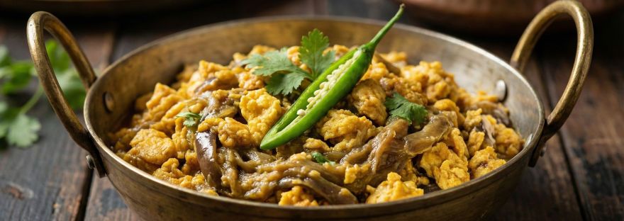 Unlike a standard French omelette which is folded and flat, a Khagina is a rustic scramble. My grandmother used to make this on winter mornings when there wasn’t enough meat for a full curry, but she wanted to give us something nutritious. It combines the smoky, charred flesh of a roasted brinjal (baingan) with the fluffiness of scrambled eggs.