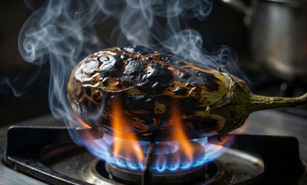 Fire Roasting: Roast the brinjal directly over an open gas flame (use a wire mesh/roti jali if you have one). Turn it frequently for about 10-12 minutes until the skin is completely charred and the inside is soft and mushy.