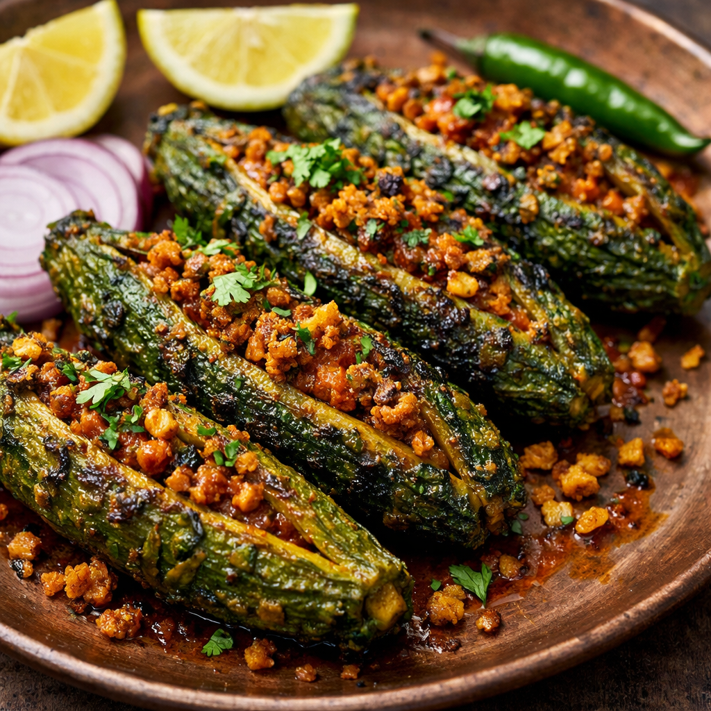 She didn’t believe in deep-frying the life out of the vegetable. Instead, she performed a morning ritual of “Zesting and Salting.” She taught me that the secret to a royal Bharli Karli (Maharashtrian Stuffed Karela) lay in the “Quiet Luxury” of the stuffing: a smoky, nutty blend of fire-grilled dry coconut and roasted peanuts. This dish is a “Parasocial Companion” on our table, a testament to my mother’s ability to transform the most challenging ingredients into a masterpiece of Indian heritage cooking.