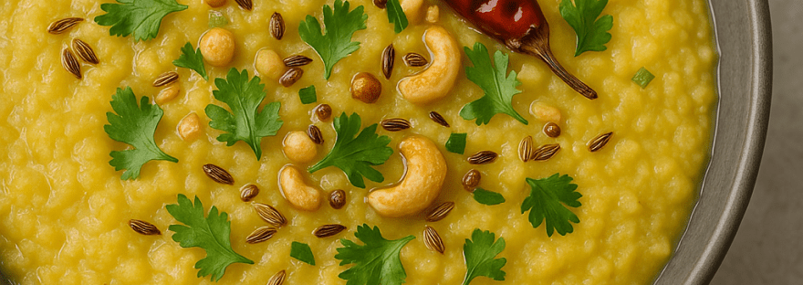 5. Finish with aromatics: Turn off the heat. Adjust salt and consistency. Swirl in a teaspoon of ghee and garnish with chopped cilantro (and a sprinkle of grated coconut for extra richness, if you like).