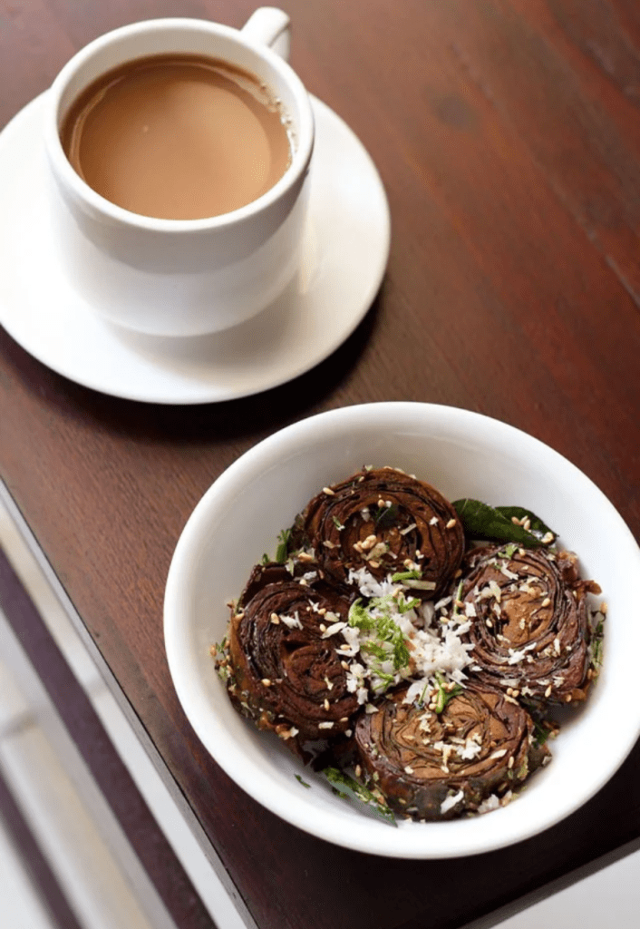 Sliced Patra (Alu Vadi) pinwheels, tempered with sesame seeds and coconut, served with chai – a beloved Gujarati/Maharashtrian snack.