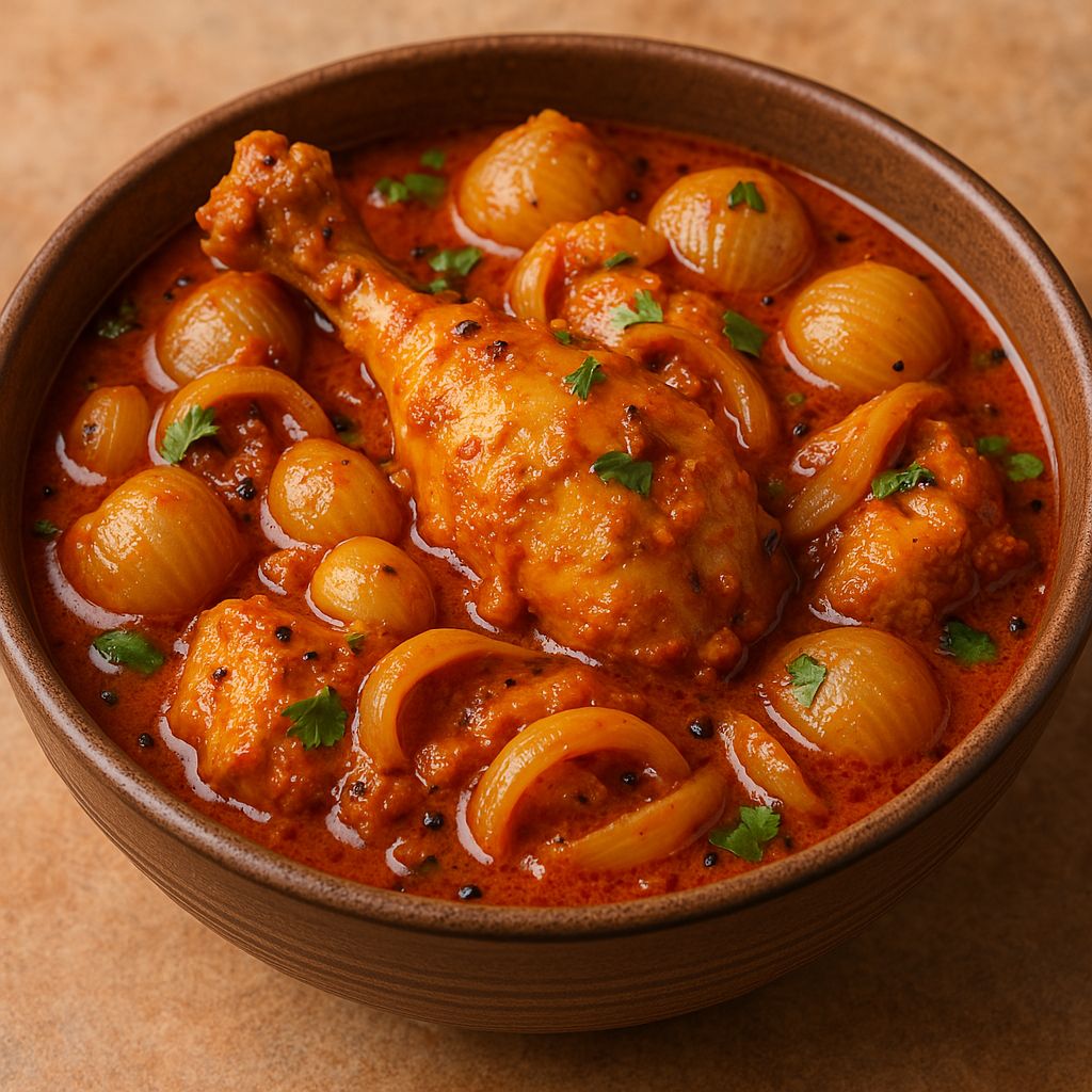 A plate of Chicken Bhuna Masala, a semi-dry curry where the thick masala clings to each piece of chicken. This rich, spicy dish is slow-cooked to achieve its signature deep flavors and thick consistency. Notice how the sauce is reduced and hugging the chicken pieces — that’s exactly what defines a great Bhuna Masala!