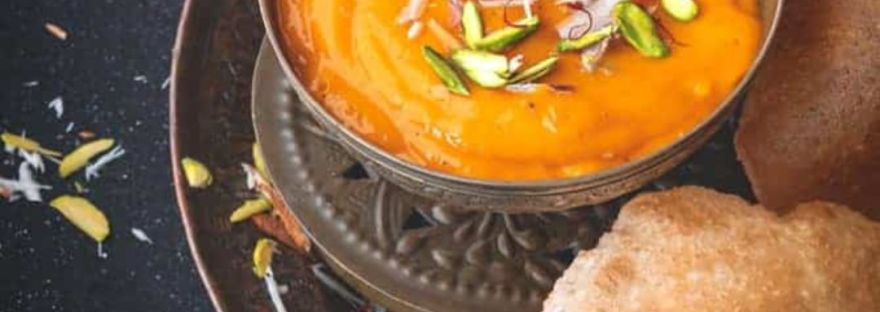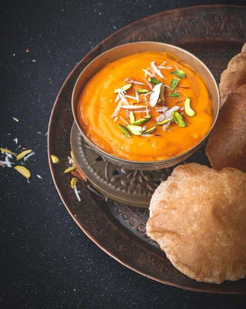Presentation: If you want to dress it up for guests or a festive occasion, get creative with presentation. You can serve aamras in elegant glass bowls or even in the mango skins (for a rustic touch). Top each serving with something pretty and tasty – a few pistachio or almond slivers, a couple of saffron strands, or that drizzle of ghee we discussed. The garnishes not only make it look festive but also add texture (nuts) or aroma (saffron, ghee). And of course, serve alongside puri – the contrast of textures (soft puree vs. puffy bread) and temperatures (cold vs. hot) is what makes this duo legendary.