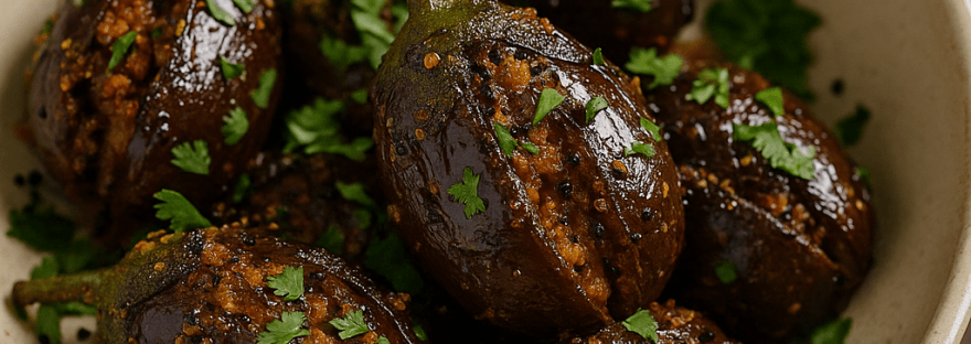 Choose tender brinjals: Small, firm baby eggplants work best. Slitting them without cutting through the stems ensures they hold the stuffing well. If large brinjals are used, you can score the sides more deeply to help the spices seep in.