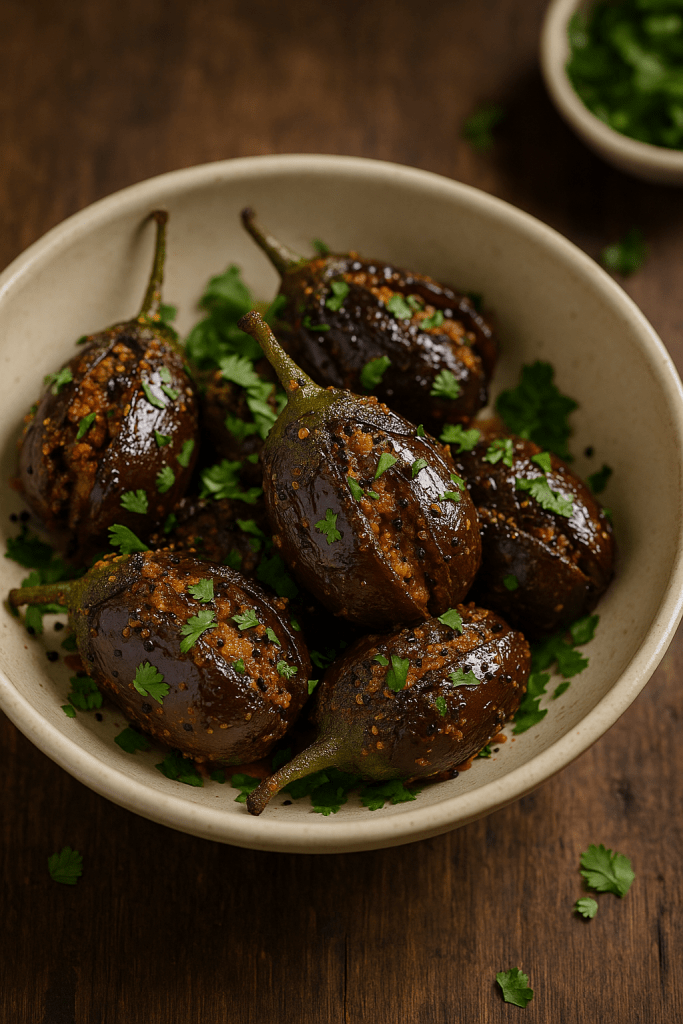 Don’t crowd the pan: Give each stuffed brinjal space to fry slightly before covering. Overcrowding can make them mushy. A heavy pan distributes heat well and prevents burning.